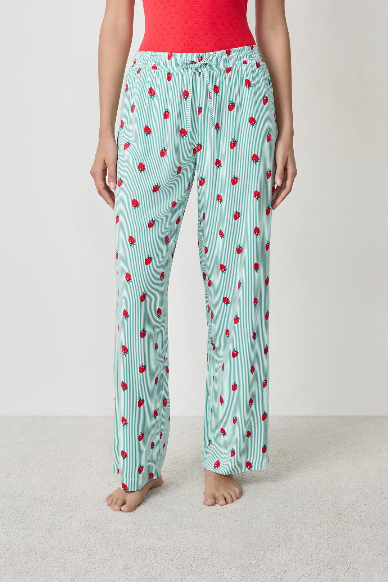 Les fraises s’invitent en all-over sur ce pantalon de pyjama. La silhouette se fait fluide grâce à sa coupe évasée, stru...