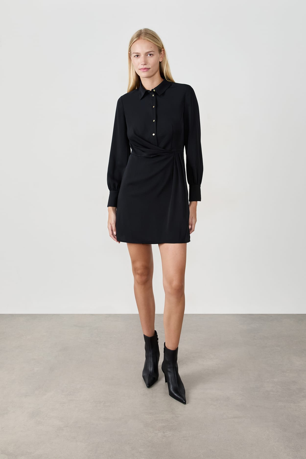 Essentiel de la garde-robe, la robe noire est revisitée en robe chemise. Muni de manches longues et d'un col chemis...