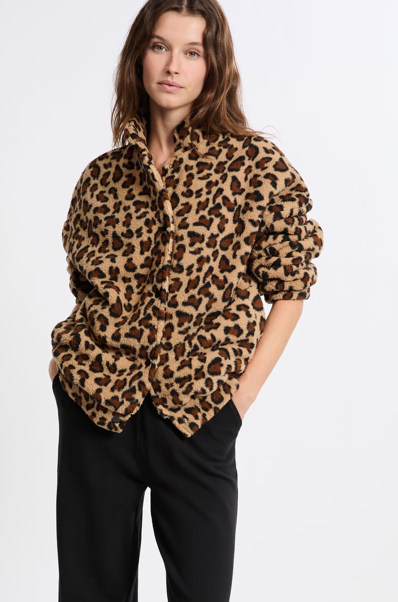 Douce et réconfortante, cette veste effet polaire est réhaussée d'un imprimé léopard en all over....