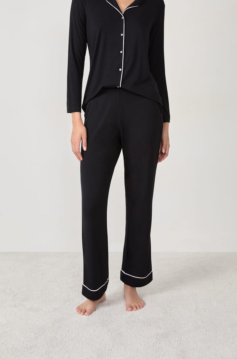 Elégance et délicatesse... Ce pantalon de pyjama dévoile une couture blanche sur le bas des jambes et une coupe ample po...