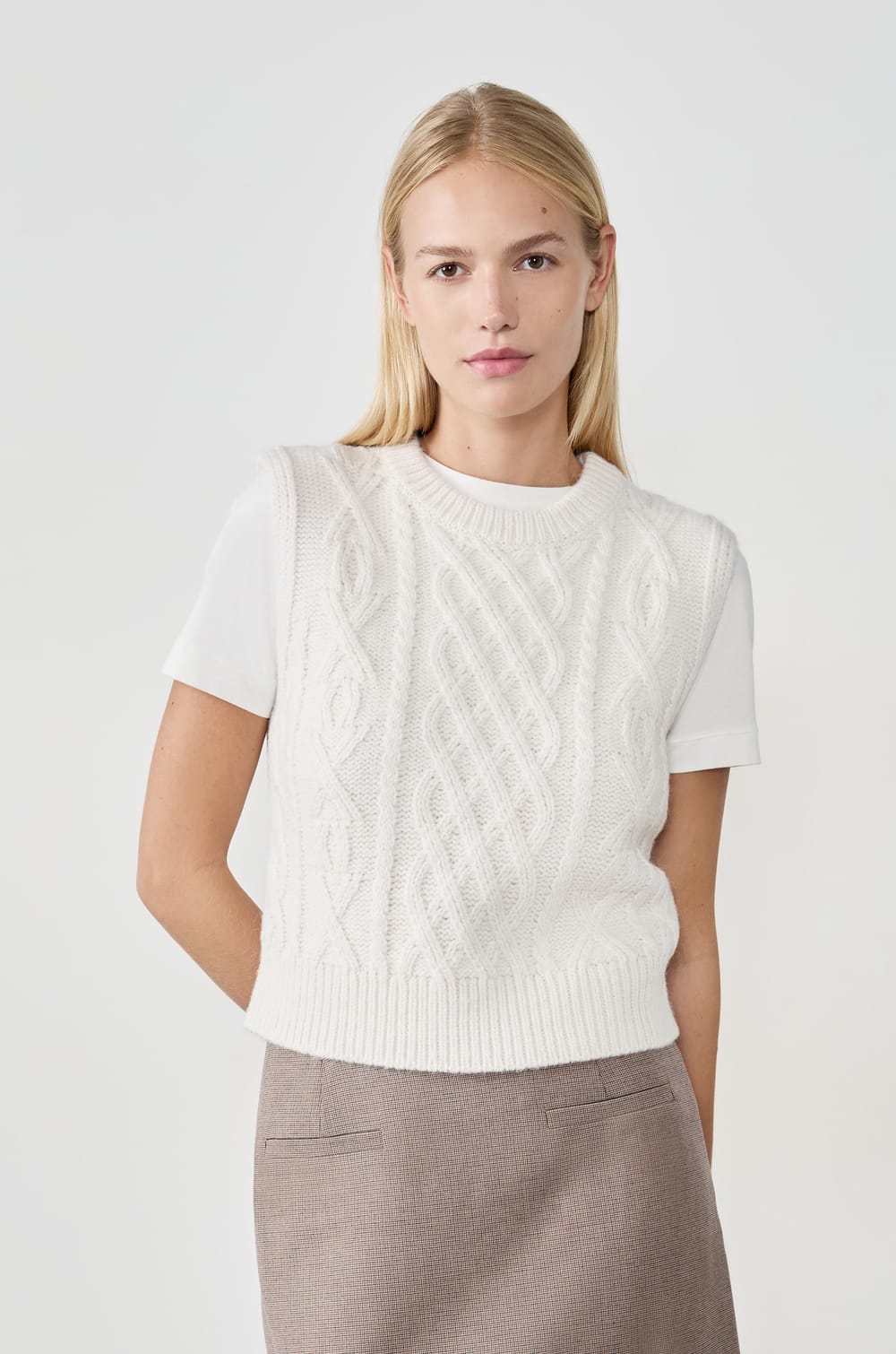 Confectionné en maille, ce pull sans manches opte pour une motif torsadé. Il se porte en superposition sur un t-shirt ou...