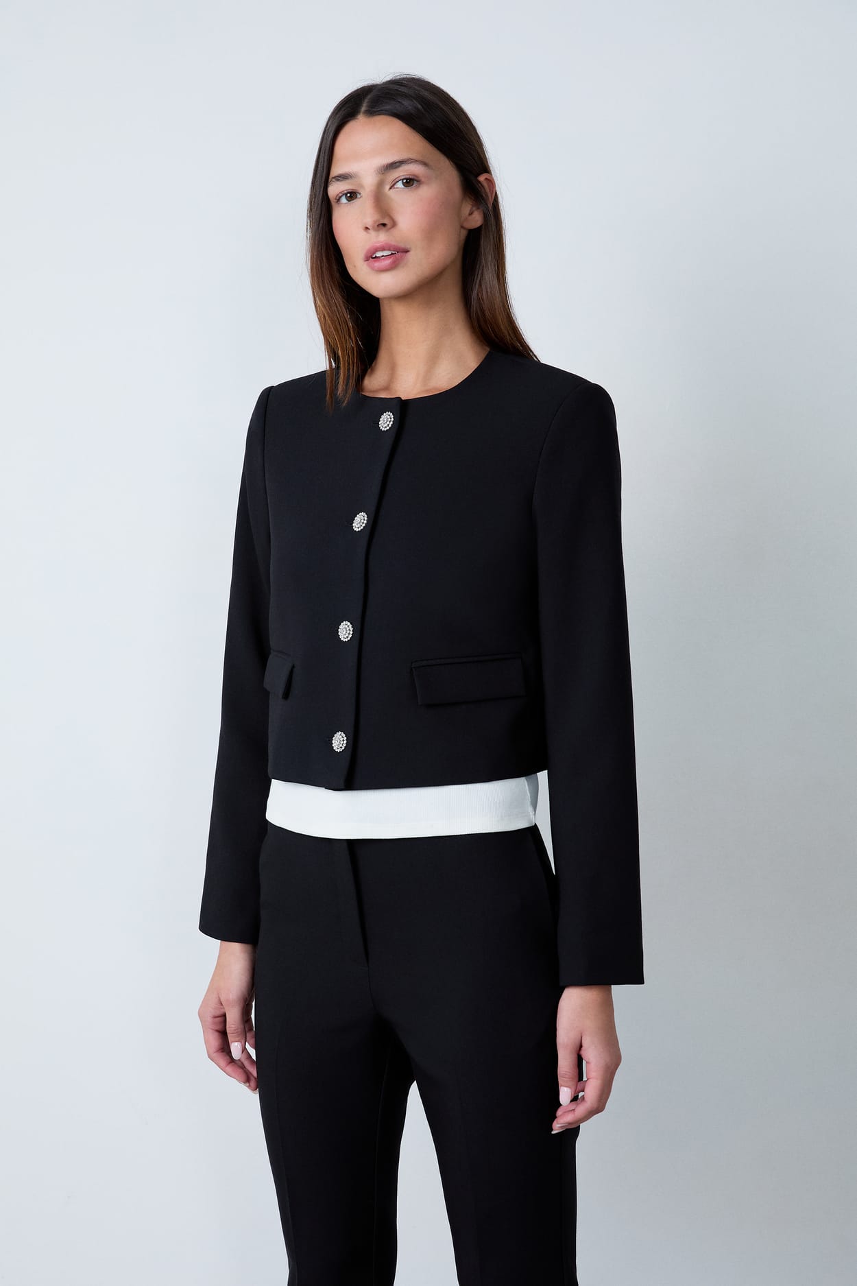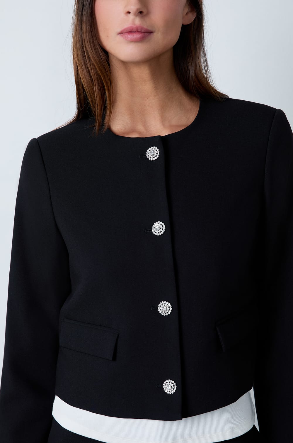 Pièce scintillante de la saison, cette veste se distingue par ses boutons incrustés de pierres. Sa coupe droite, ses man...