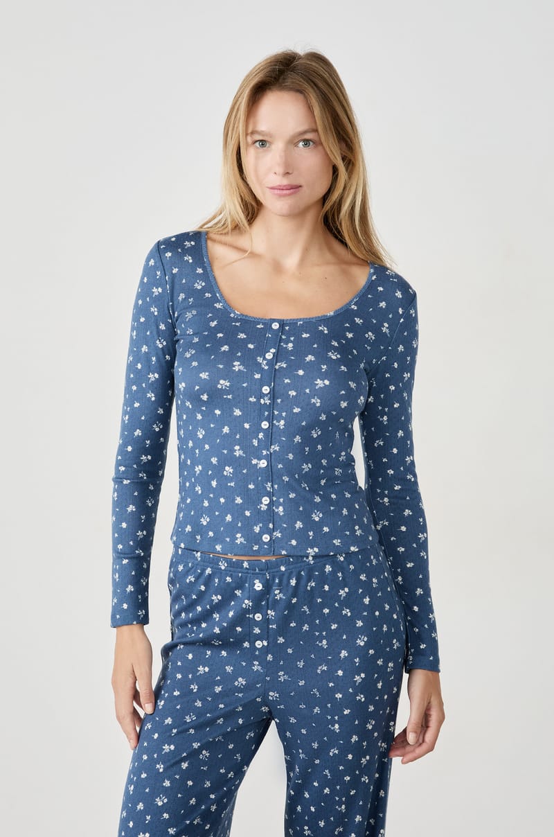 Ce t-shirt de pyjama opte pour un motif fleuri est une fermeture boutonnée. Il s'associe avec le pantalon assorti....