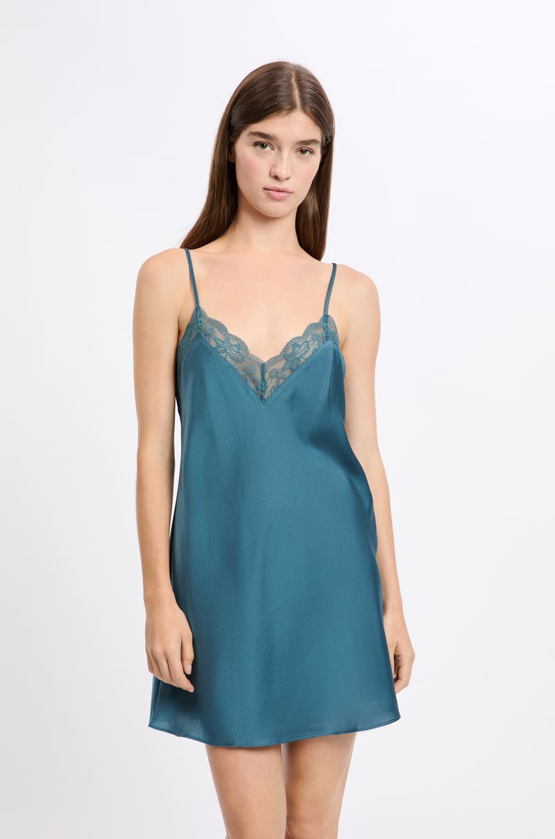 L’essentiel des nuits chics ? Une nuisette courte, satinée et bordée d’une délicate dentelle fleurie. Avec ses fines bre...