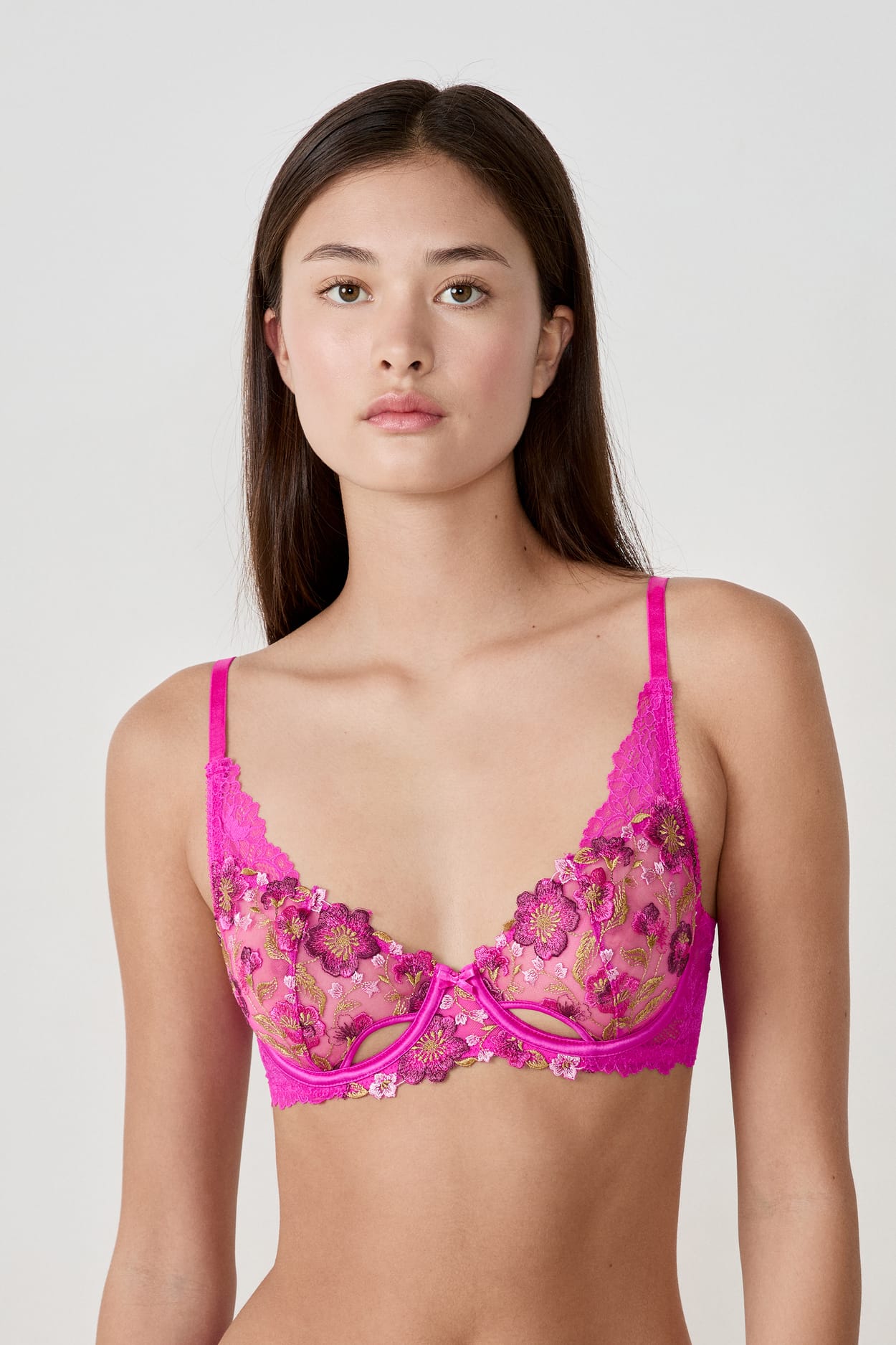 Une basque en dentelle finement travaillée, des broderies florales en trompe-l’œil, un nœud délicat à l’entrebonnet : no...
